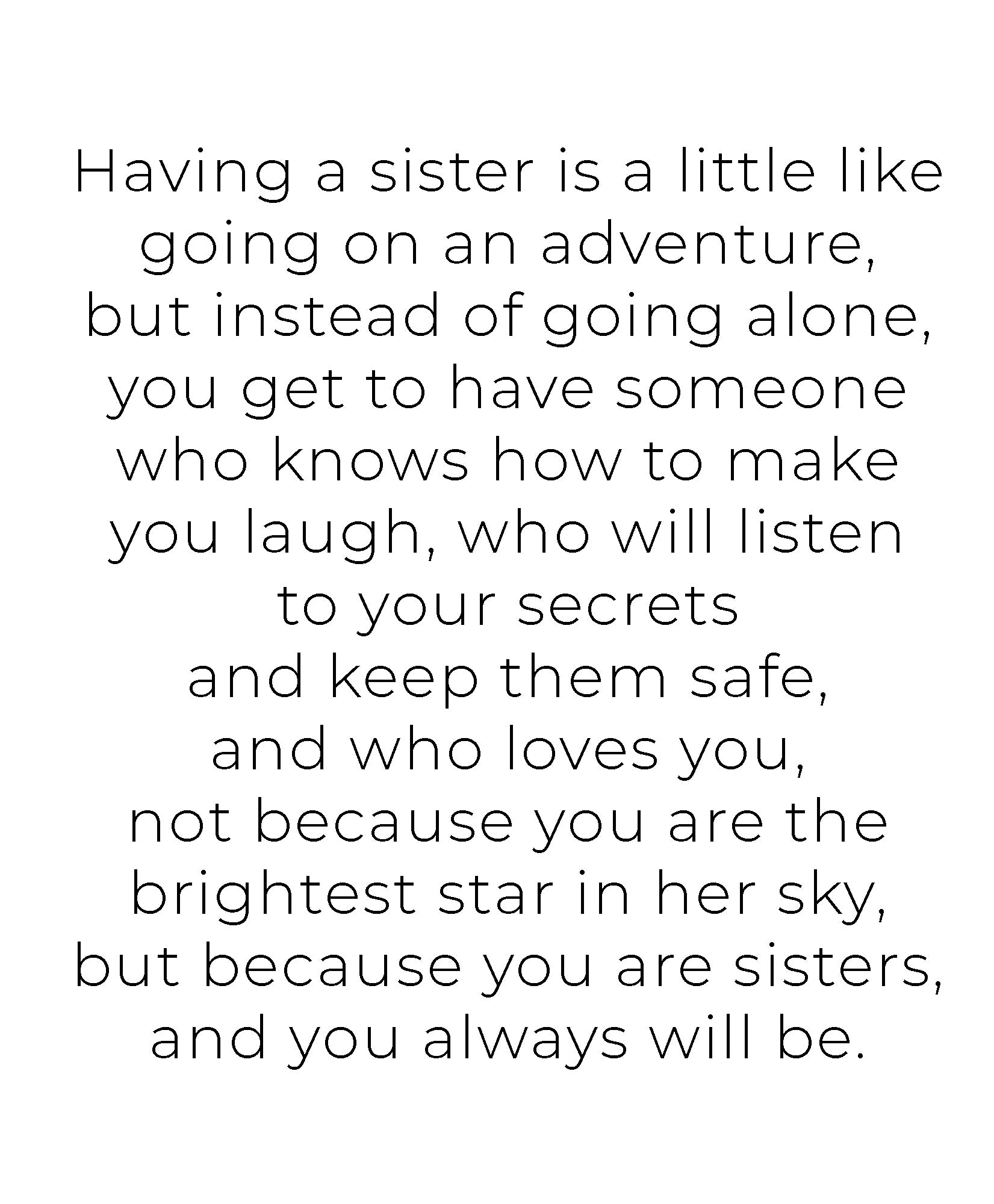 Having a sister is a little like going on an adventure, but instead of going alone, you get to have someone who knows how to make you laugh, who will listen to your secrets and keep them safe, and who loves you, not because you are the brightest star in her sky, but because you are sisters, and you always will be.