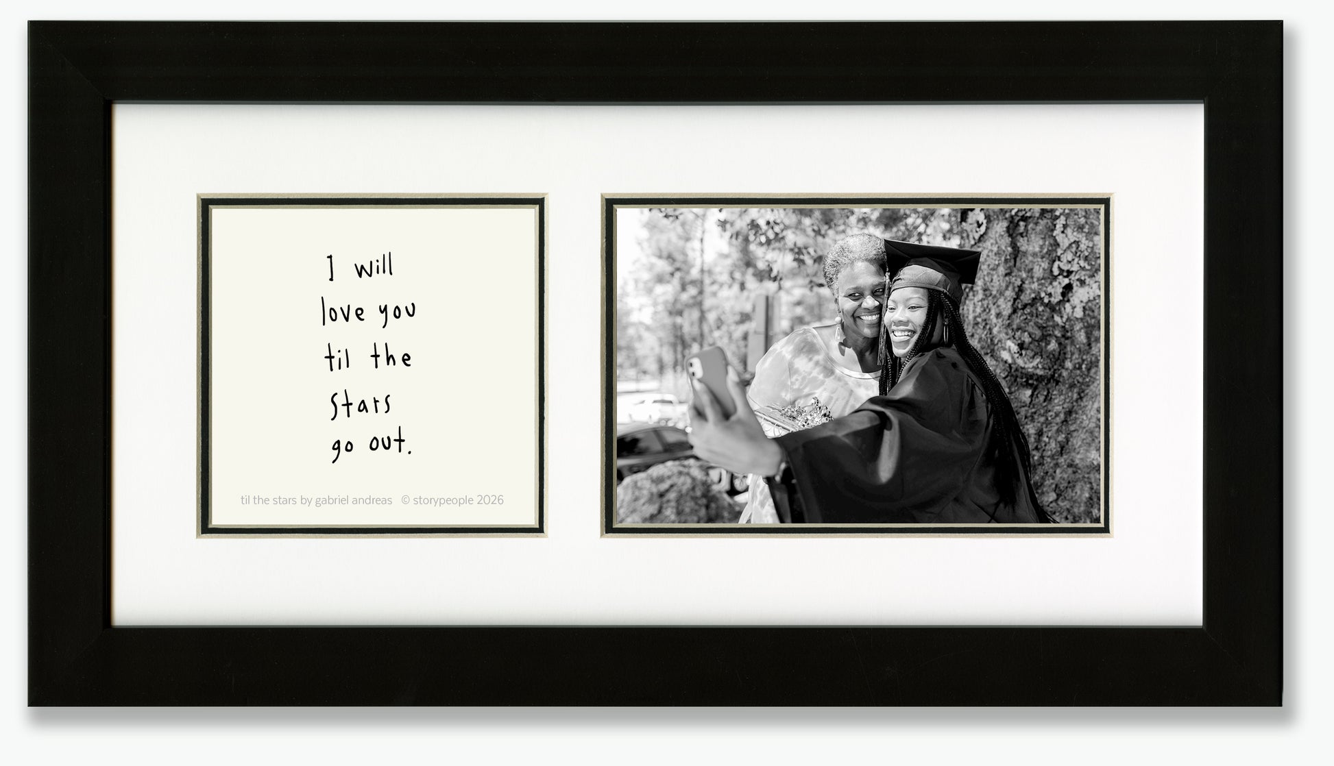 I will love you til the stars go out.Story on elegant translucent paper. Double layer mat - white with black inner mat, 4x4 story opening and 4x6 photo opening. Overall dimensions 8x15. Black powder-coated wood frame with glass.